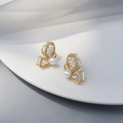Elegant Silver Needle Pearl Butterfly & Flower Stud Earrings